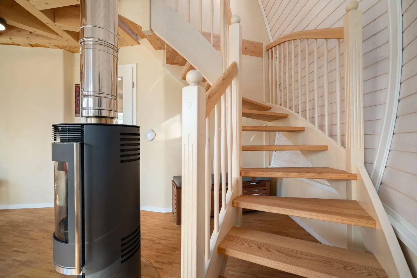 Das Schlafzimmer beherbergt ein komfortables Doppelbett; im Wohnbereich bietet ein Schlafsofa zwei weitere, bequeme Schlafplätze – perfekt für Kinder oder Freunde. Das moderne Bad mit Dusche, WC und Waschbecken rundet das Erdgeschoss ab. Unter der Lichtkuppel lädt eine ruhige Ecke zum Lesen, Meditieren oder einfach zum In-die-Runde-schauen ein – ein kleines Lieblingsplätzchen im Haus.
