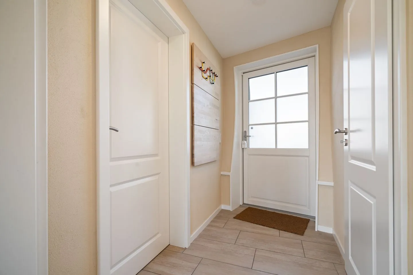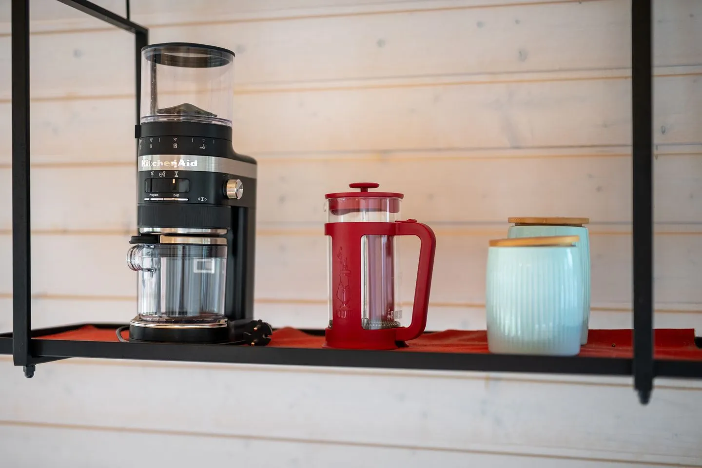 Im Erdgeschoss verschmelzen Kochen, Essen und Wohnen zu einem hellen Mittelpunkt. Bodentiefe Fenster öffnen den Blick ins Grün und holen viel Tageslicht ins Haus. Die Küche ist für die Selbstversorgung komplett ausgestattet – u. a. mit Kochfeld, Backofen, Geschirrspüler, Kühl-/Gefrierfach, Kaffeemaschine, Wasserkocher und Toaster. Am Esstisch ist Platz für gemeinsame Mahlzeiten und lange Gespräche, danach wird der Wohnbereich zur gemütlichen Lese- und Spiele-Zone. Für stimmungsvolle Abende sorgt der Kaminofen.