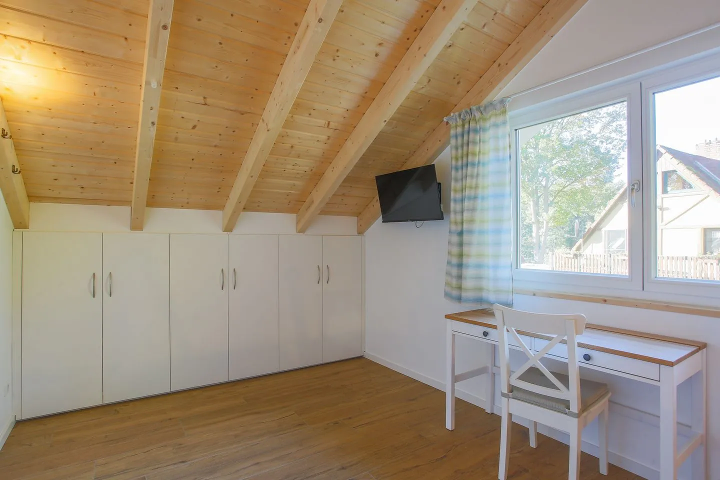 Für erholsame Nächte stehen zwei separate Schlafzimmer bereit – ruhig gelegen und behaglich eingerichtet. Nach einem Tag am See kehrt hier angenehme Stille ein; jeder findet seinen Platz zum Lesen, Träumen und Ausschlafen. Das natürliche Holz prägt den Charakter des Hauses und sorgt zu jeder Jahreszeit für ein angenehmes Wohnklima.